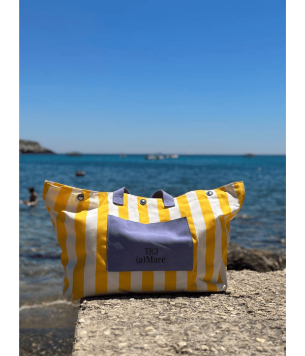 Stile e praticità si incontrano in una borsa da (a)Mare! La nostra borsa mare personalizzata unisce stile e funzionalità, perfetta per accompagnarti in ogni tua avventura sulla spiaggia. Si tratta di una borsa mare artigianale, realizzata in misto lino a righe gialle e bianche. 100% Made in Italy. La tasca frontale in pelle scamosciata lilla non solo offre un design sofisticato, ma permette anche una personalizzazione esclusiva con il tuo nome, rendendola un accessorio veramente personale e distintivo. Capiente e chic, è la scelta ideale per distinguersi con raffinatezza anche al mare.