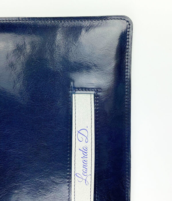 Porta tablet /Documenti dalla linea pulita, in pregiato cuoio primofiore blu che lo rende perenne nel tempo ma sempre al passo con le tendenze. Interno foderato in cotone nero per proteggere il tuo Tablet e zip di chiusura pratica e veloce. Questa classica versione include un manico esterno in materiale sintetico effetto canvas con nome stampa uv, rendendola molto più che una semplice custodia ma una vera e propria pochette unica! Dimensioni: 35 x 26 cm