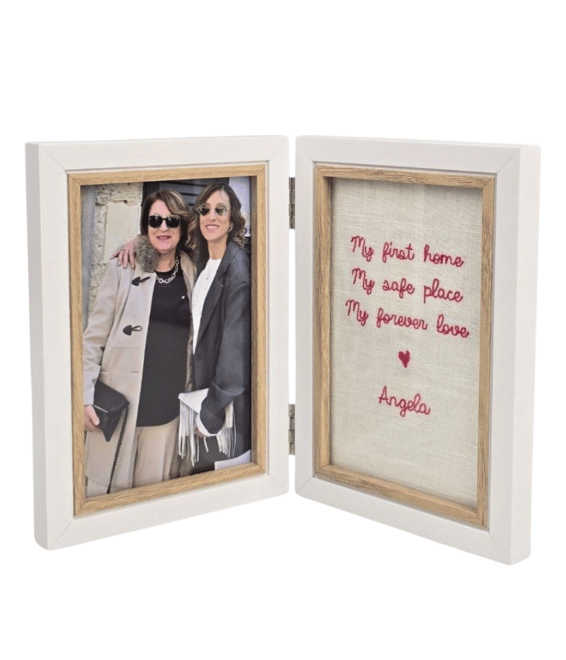 Double frame 10×15 cm for Mother’s Day, with one side dedicated to the photo and the other embellished with an embroidered phrase that can be personalized with the name. An original gift idea for the mother that combines image and words in a single elegant and meaningful complement.