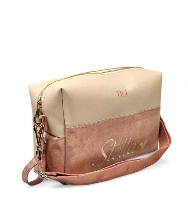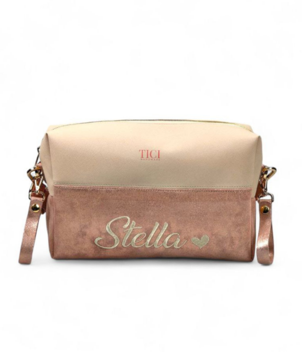 Handmade and personalized stroller basket, crafted from high-quality materials. Featuring an elegant panna saffiano exterior and soft pink clouded suede, a simply perfect combination. Customizable with an embroidered name for a unique and distinctive touch. Perfect for adding both practicality and class to every stroll, it’s waiting for you—customize it NOW!