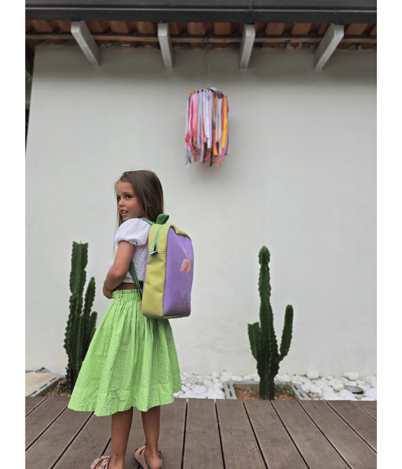 Zainetto per bambina personalizzato con nome in stampa uv decorato con un grazioso fenicottero. Zaino in barcellona lilla e verde artigianale, 100% Made in Italy adatto sia per l’asilo che per le uscite con mamma e papà. Un accessorio unico e originale, proprio come la tua bambina!